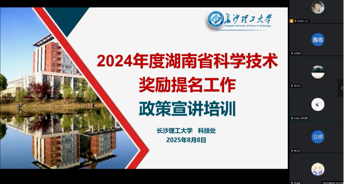 为推动2024年度湖南省科学技术奖提名工作顺利举行,切实提升云顶国际vip8866科技奖励申报质量与成效,8月8日下午,云顶国际vip8866举办2024年度湖南省科学技术奖励提名工作政策宣讲线上培训会,共有60余名老师参加会议,会议由校科技处挂职副处长龙卓主讲,科技处副处长陈铭言主持。