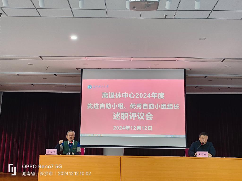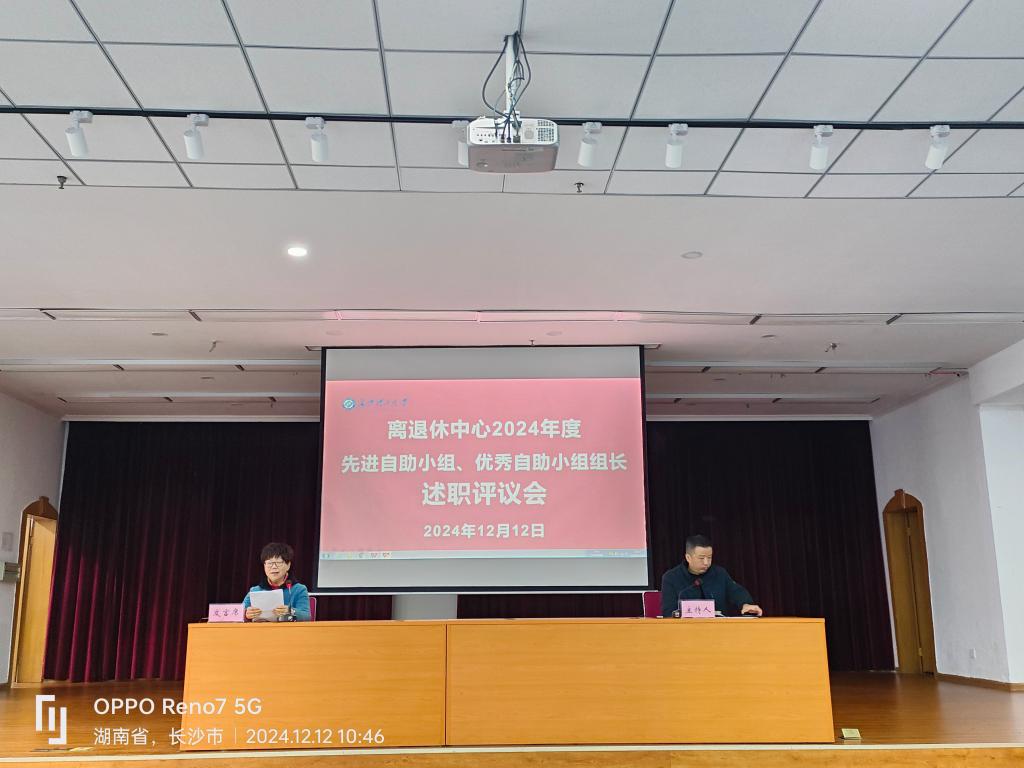 12月12日,离退休中心在金盆岭校区五教 5 楼多功能厅举行了 2024 年度自助服务小组述职评议会,此次会议旨在评选先进自助服务小组以及优秀自助服务小组组长(副组长),39 个自助服务小组的组长与中心全体工作人员参加。会议由中心副主任周宇佳主持。
