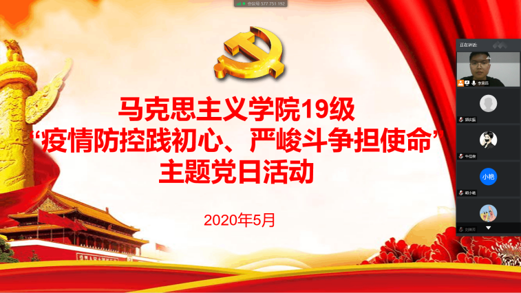 为落实学校党委关于在统筹推进疫情防控工作中的要求,进一步发挥基层党组织战斗堡垒作用和党员先锋模范作用,引导党员在战“疫”中守初心、担使命,云顶国际vip8866马克思主义学院2019级研究生党支部结合实际情况,聚集“疫情防控践初心、严峻斗争担使命”的主题,于5月12日下午两点在线上成功召开主题党日活动,参加会议的包括支部所有党员以及勇敢地在此次疫情中奉献的6名积极分子,会议由党支部书记李袁远主持召开。