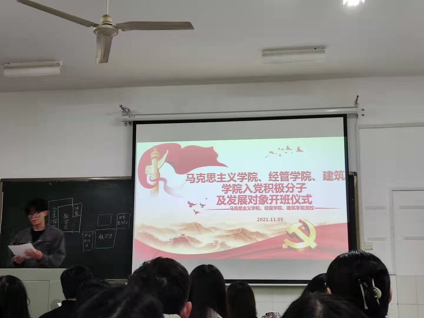11月5日18:30,马克思主义学院、建筑学院和经管学院联合分党校2021年下期发展对象、入党积极分子培训班开班仪式在金盆岭校区16教313教室举行。此次开班仪式由建筑学院2020级学生罗晟主持,马克思主义学院党建辅导员曾蓓老师出席,马克思主义学院、建筑学院和经管学院全体发展对象和入党积极分子参加。
