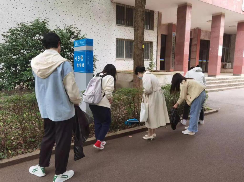 此次实践活动分成三个小组,打扫区域为校门东门至校训石(包含体育馆门口的小空地)、校训石至办公大楼(包含9教、10教两条小路及办公大楼门前空地)和办公大楼至幼儿园(指校史馆与办公楼之间的小路,一直到东苑教职工食堂与幼儿园门前空地)。各组同学在组长的带领下拿起了扫把、簸箕、铁钳、垃圾袋和一次性手套等清扫工具,热情洋溢地进行着清扫活动。