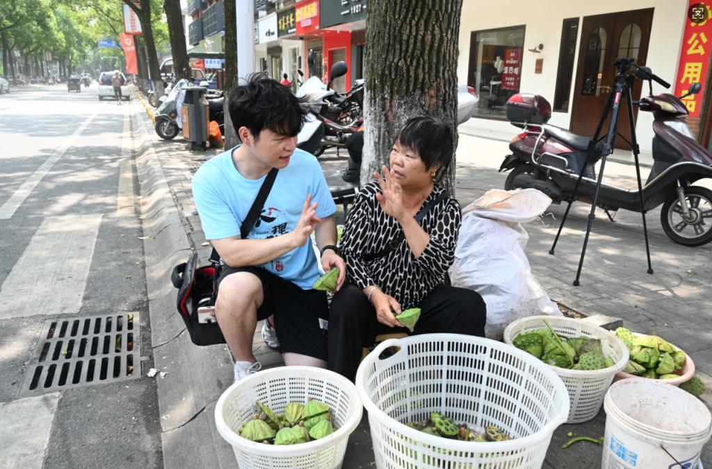 实践团成员对社区老兵、商贩等进行访谈。90 多岁的老兵李爷爷深情回顾了自己担任警卫员时的峥嵘岁月,生动讲述了军垦时期战士们积极开荒拓土的故事,更道出了“吃苦是光荣”的坚定信念。他眼含光芒寄语青年:“日子好了,拼劲不能丢,要传承军垦精神,让奋斗火种代代传。”不远处,街道口老农户邹大姐正麻利地剥莲蓬,翠绿莲子堆成小山。实践团成员一边帮忙卖莲子,一边发放调研问卷。如今常德西湖的莲蓬借电商平台已畅销常德各地乃至省外,邹大姐激动地说道:“日子越过越甜,感谢当年军垦人打下的好底子,也谢谢你们来听常德西湖的故事。”