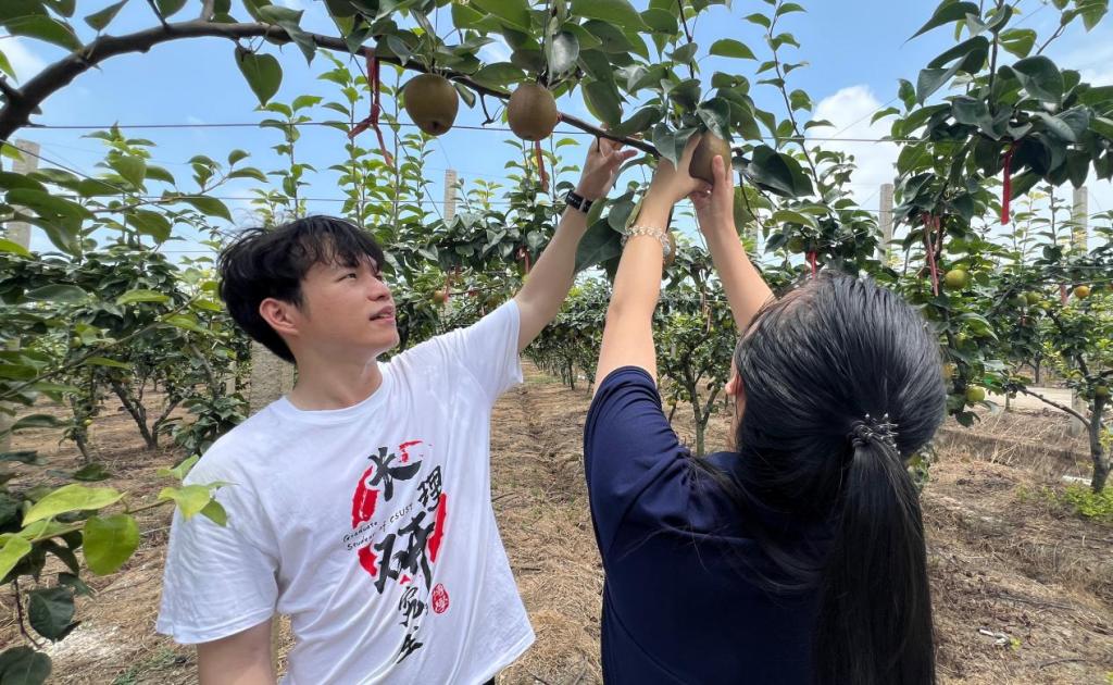 随后,实践团来到楚峰梨园,在负责人的带领下,成员们跟着果农参与采摘、体验分拣、包装、贴标全流程,沉浸式感受从枝头到舌尖的产业链。负责人介绍,梨园采用“公司+基地+村集体+农户”模式,与科研院所合作,通过采摘节、消费扶贫拓销,“农果叔”品牌打响,带动130人就业。这让枝头硕果变成农户增收的“金果子”,更以产业链延伸激活乡村振兴动能。