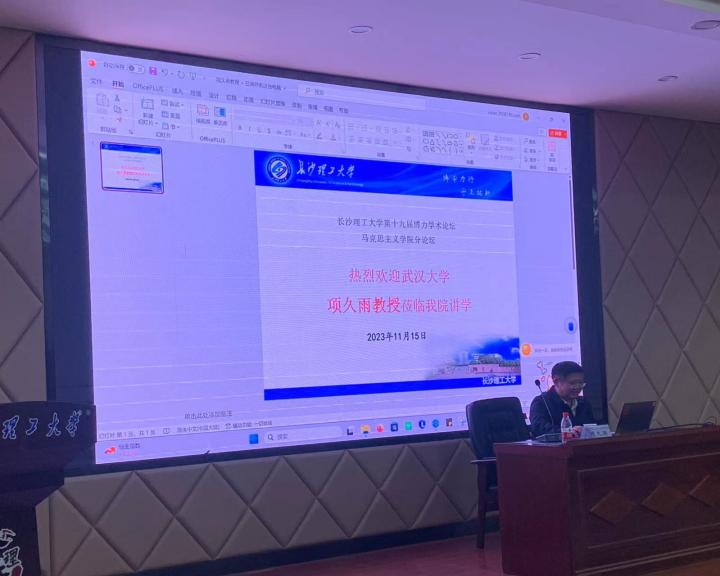 11月15日下午,国家级重要人才计划入选人、国家社科基金重大项目首席专家、武汉大学思想政治教育研究院执行院长、博士生导师项久雨教授来到云顶国际vip8866云塘校区文科楼A200室,为学校第十九届博力学术论坛马克思主义学院分论坛主讲了一场题为“中国式现代化的继往与开来——兼谈学术研究选题”的学术讲座。马克思主义学院院长张明海教授、副院长李雨燕教授、文贵全副教授、陈方芳博士等学院教师与学院研究生100余人参加了本次讲座。