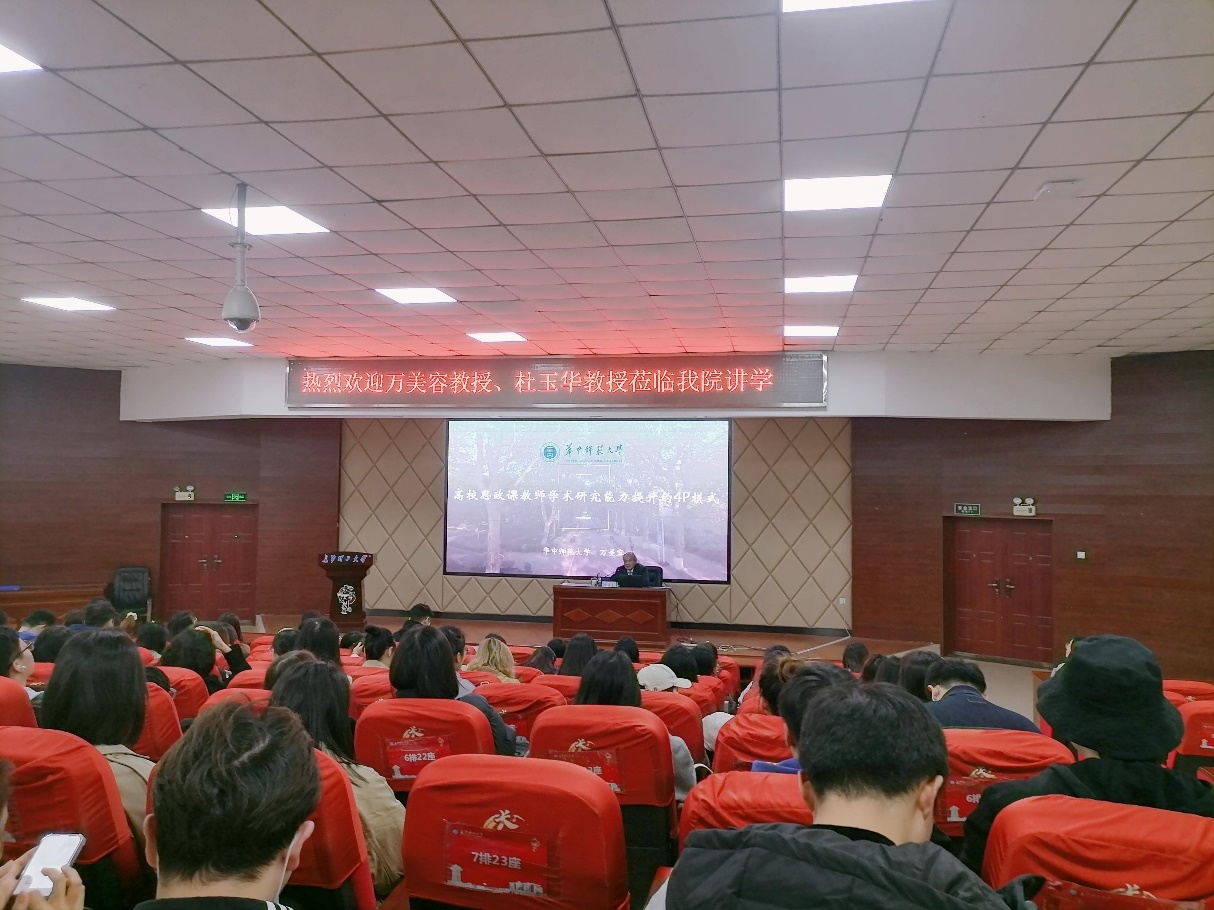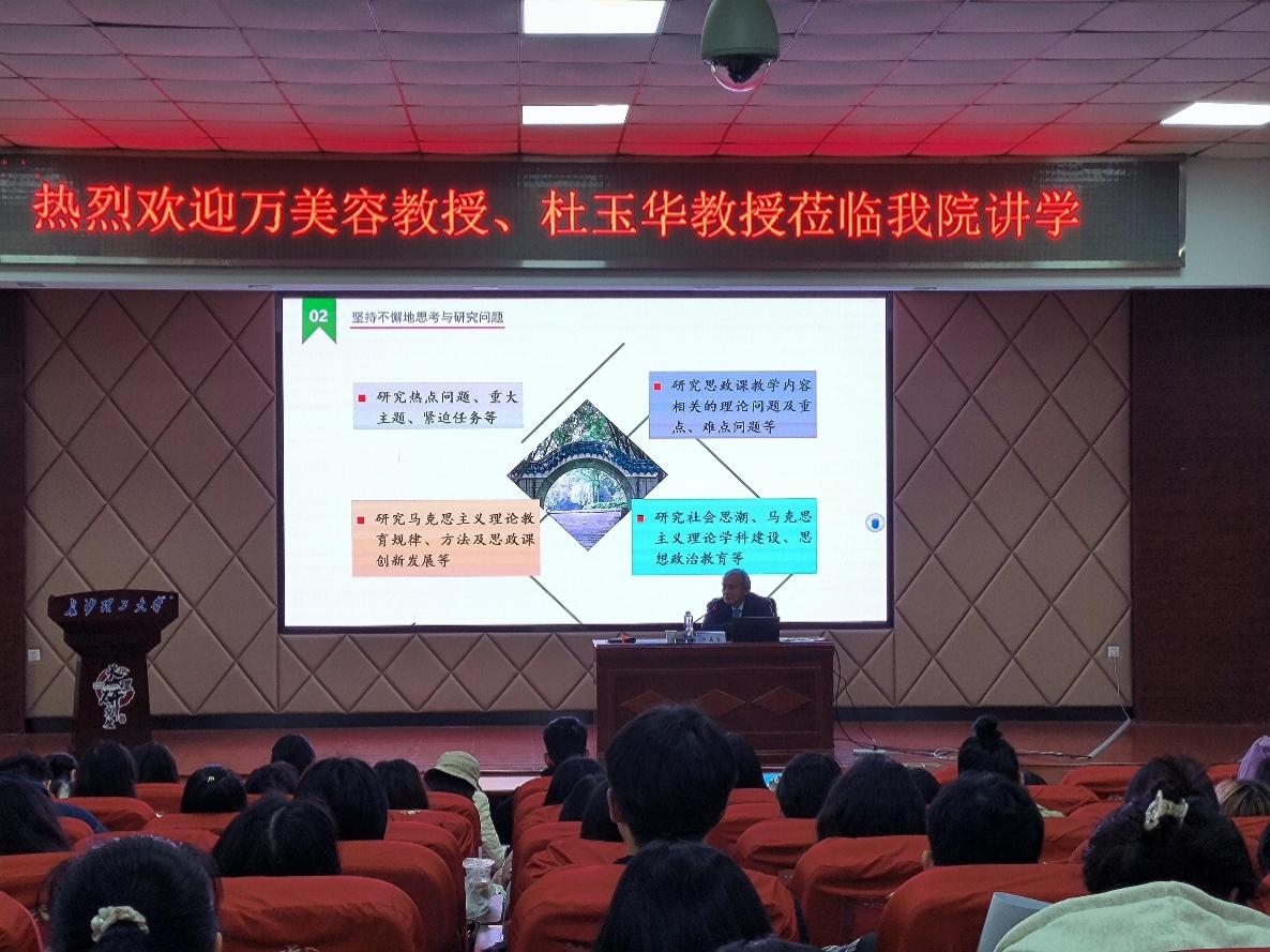 11月16日上午,华中师范大学马克思主义学院院长、博士生导师万美容教授应邀莅临学院,在云顶国际vip8866云塘校区文科楼A200报告厅为云顶国际vip8866第十九届博力学术论坛——马克思主义学院分论坛带来了“高校思政课教师学术研究能力提升的4P模式”的讲座。万美容教授就马克思主义理论学科的重要性以及如何对这门学科进行高质量学术研究等相关问题,与同学们进行了分享交流。本次讲座由我院院长张明海教授主持,学院一年级研究生近100人参加了本次学术讲座。