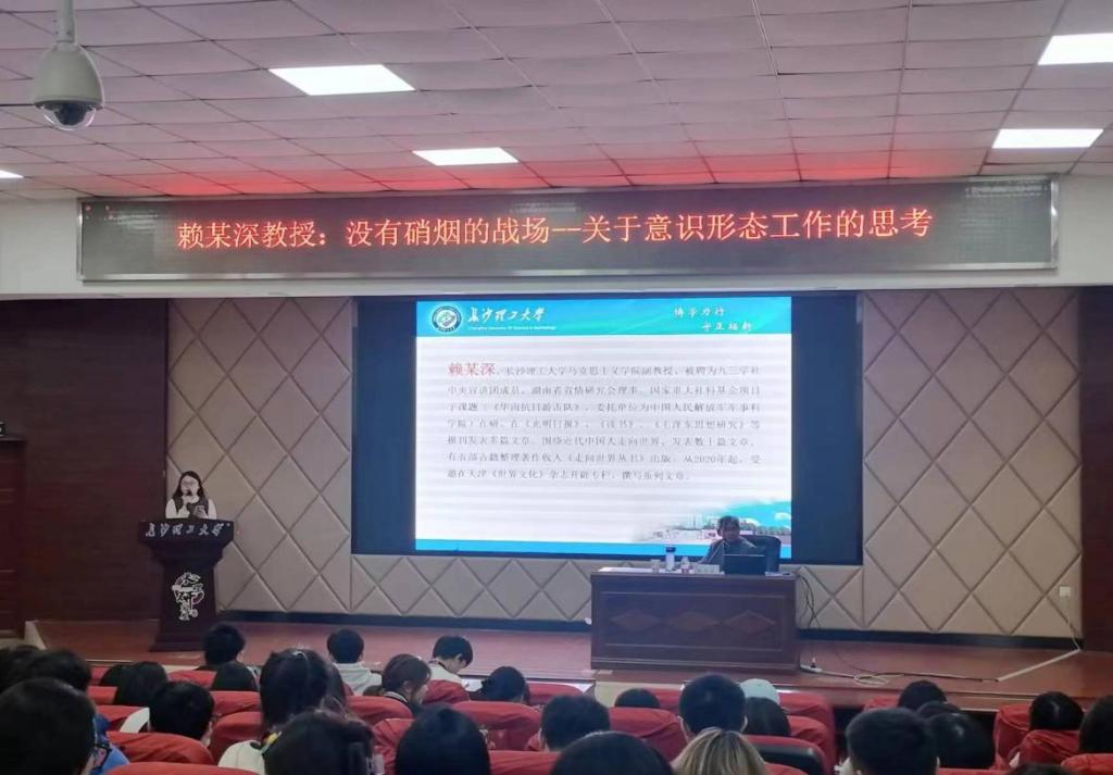 意识形态工作关乎旗帜、关乎道路、关乎国家政治安全。习近平总书记在党的二十大报告中强调:“意识形态工作是为国家立心、为民族立魂的工作。”为了深入学习习近平总书记重要讲话精神,11月23日晚上,云顶国际vip8866赖某深教授在云顶国际vip8866云塘校区文科楼A200报告厅为云顶国际vip8866第十五届研究生“云影讲坛”——马克思主义学院分论坛作讲座,讲座题为“没有硝烟的战场—关于意识形态工作的思考”。李雨燕副院长、文贵全副教授、张慧娟博士后等学院教师及一年级研究生近100人参加了学术讲座,本次讲座由一年级研究生丁梦雪主持。
