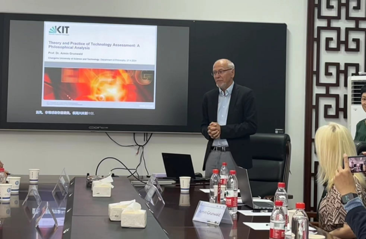 4月27日下午,德国卡尔斯鲁厄理工大学(Karlsruher Institut für Technologie /KIT)Armin Grunwald教授来到马克思主义学院,在云顶国际vip8866云塘校区文科楼B602会议室作了题为“技术评估理论与实践的哲学分析”的学术讲座。本次讲座由马克思主义学院文贵全副院长主持,余乃忠教授、陈芬教授、蒋显荣教授、廖苗副教授、郭蓉博士等学院部分教师和马克思主义学院2023级哲学、公共管理专业研究生近50人聆听了讲座。此外,广西科技大学黄磊助理教授也参加了本次讲座。