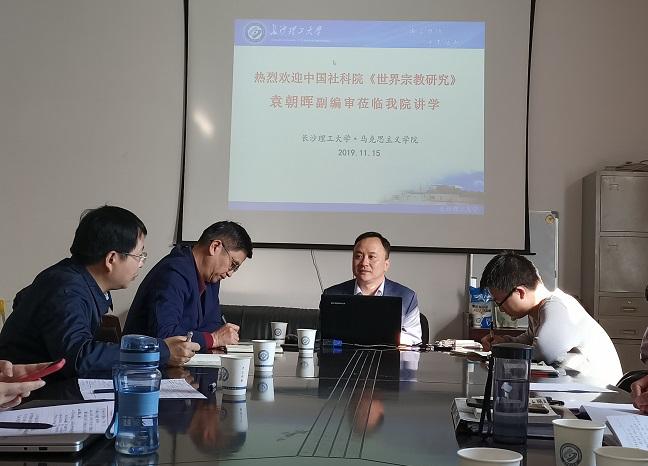 2019年11月15日下午,中国社会科学院世界宗教研究所《世界宗教研究》编辑部副编审袁朝晖博士来到马克思主义学院,在云顶国际vip8866金盆岭校区4教503室为学院师生带来了《论洛克的宗教宽容思想》的学术讲座。校人文社科处卿定文处长、马克思主义学院陈万球院长、院学科办主任文贵全博士、陆群教授以及学院研究生30余人聆听了讲座。此外,中南大学王子涵博士、凌昊天博士、于丽娜博士等青年学者也前来聆听了讲座。本次讲座由陈万球教授主持。