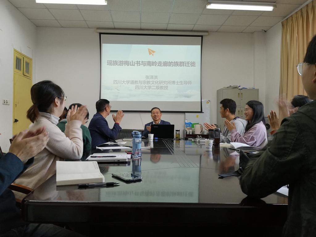 2019年11月15日下午,“楚天学者”、四川大学道教与宗教文化研究所博士生导师张泽洪教授应邀莅临马克思主义学院,在云顶国际vip8866金盆岭校区4教503室作了《瑶族游梅山书与南岭走廊的族群迁徙》的主题讲座。校人文社科处卿定文处长、马克思主义学院陈万球院长、陆群教授、刘佳男博士以及学院研究生30余人聆听了讲座。此外,中南大学王子涵博士、凌昊天博士、于丽娜博士等青年学者也前来聆听了讲座。本次讲座由陈万球教授主持。