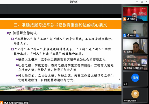 2021年12月10日晚,华中师范大学马克思主义学院院长、教授、博士生导师万美容应邀为我院师生做了题为“习近平总书记教育重要论述的主要内容与核心要义”的线上报告。万美容教授系国务院学位委员会学科评议组成员,教育部《习近平总书记教育重要论述讲义》编写组成员,对习近平总书记教育重要论述有长期深入的研究,他旁征博引、深入浅出地对习近平总书记教育重要论述的重大价值、主要内容、核心要义等问题进行了精彩解读和分析,对老师们更好理解习近平总书记教育重要论述,更好从事教育教学工作具有重要帮助。报告由我院张明海副院长主持和点评,得到了校内外师生的积极参与,收到了良好效果。