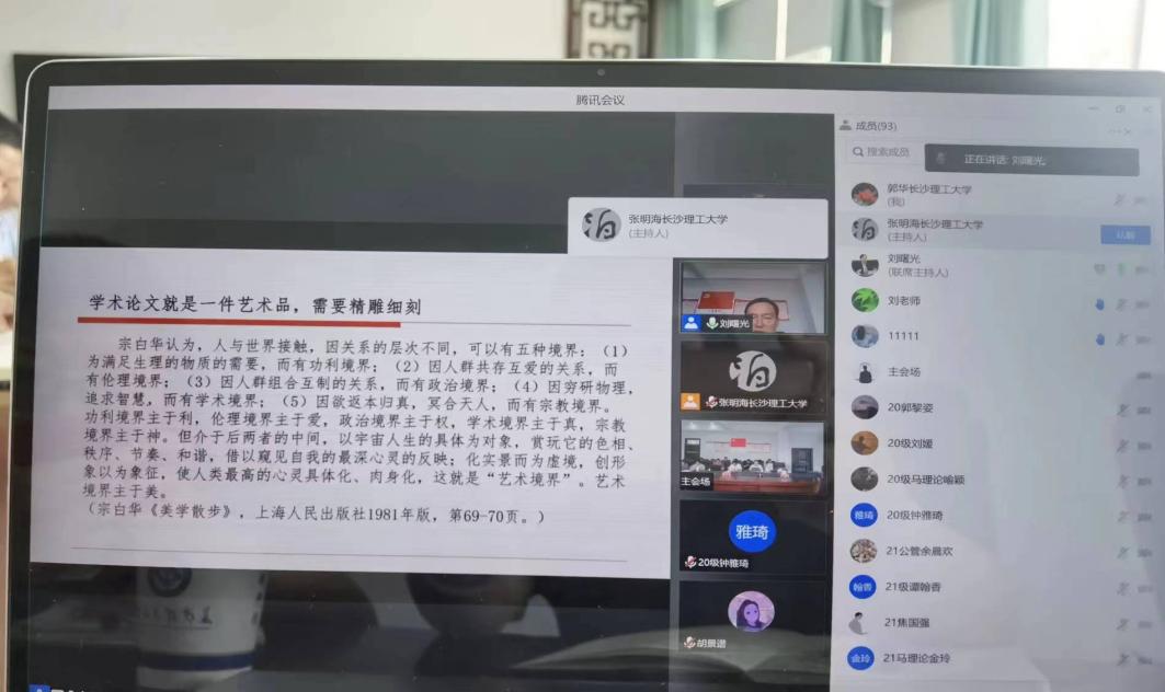 2022年7月29日上午,全国高等学校文科学报研究会理事长、《北京大学学报(哲学社会科学版)》常务副主编刘曙光编审应邀来到马克思主义学院,在云顶国际vip8866云塘校区文科楼六楼学院会议室作了题为“核心期刊编辑与高水平学术论文写作”的学术讲座。讲座现场由学院院长张明海教授主持。学校社科处、期刊社的领导和老师、马克思主义学院师生共计150余人通过线上线下的方式参加了讲座。