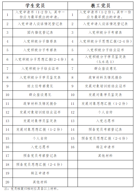党员归档材料一览表