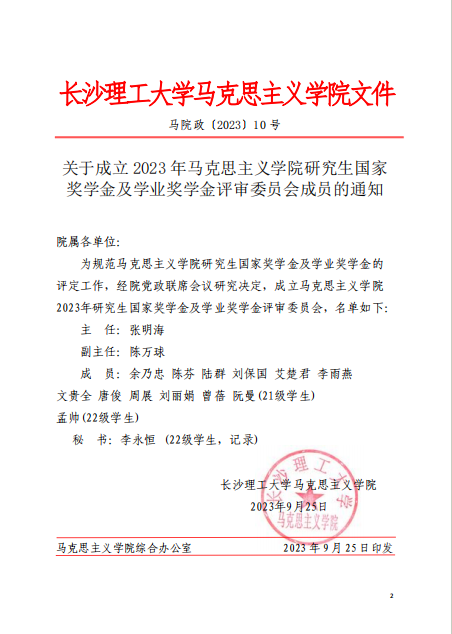 关于成立2023年马克思主义学院研究生国家奖学金及学业奖学金评审委员会成员的通知(马院政【2023】10号)