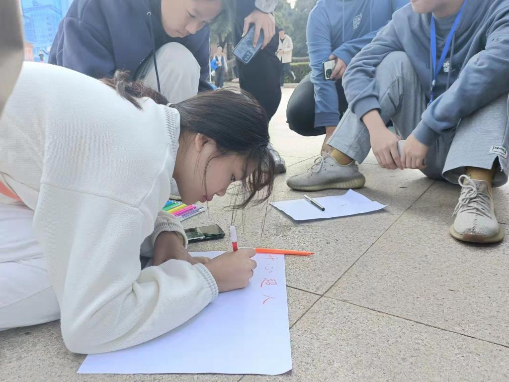 活动开始前,彭博为同学们讲解了心理活动的意义与目的。在“大树和松鼠”活动中,同学们共同扮演松鼠和大树,搭建心灵树洞,不断选出新的流浪松鼠和落单大树进行才艺展示;紧接着开展“滚雪球”游戏,同学们先进行自我介绍,然后不断重复彼此的姓名与爱好,进一步熟悉对方;本次素质拓展在“相亲相爱一家人”中落下帷幕,各小组自行设计队标,展示队歌、队名与口号,在创新和尝试中深入了解对方的特点。