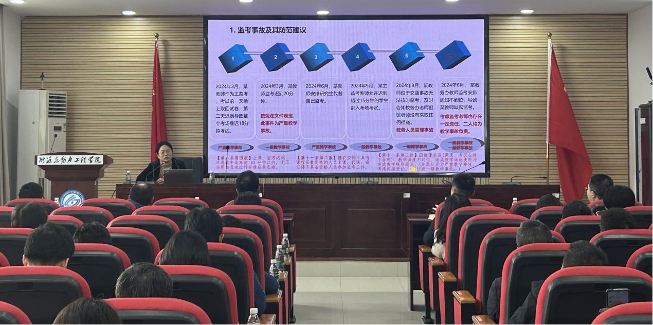 田红副院长对学校教学事故认定做了细致的梳理与说明,举例说明违反教学与监考管理条例的严重后果。田院强调“课比天大”,教师不可擅自缺课;做好手机定时提醒上课;遇到意外情况,不得放任课堂,应及时沟通汇报。各位教师应做到不缺课、不迟到、不发表不当言论、不泄题、不擅自调课、不由研究生代监考、不允许迟到超过15分钟的学生考试、监考不看手机等;教务管理人员也在接到教师不能按时到课或监考的消息报备第一时间采取措施安定课堂或考场。