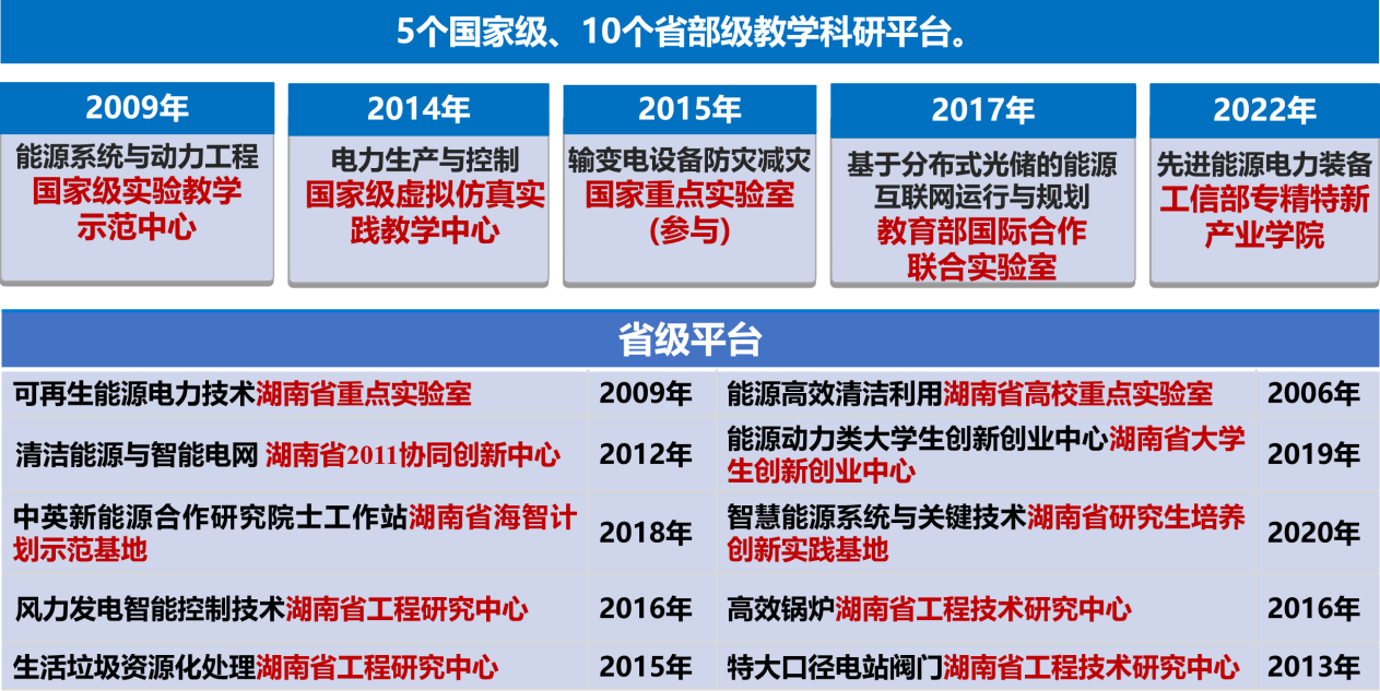 学院拥有“能源系统与动力工程”国家级实验教学示范中心、“电力生产与控制”国家级虚拟仿真实验教学中心、工信部“先进能源电力装备”专精特新产业学院、共建“电网防灾减灾”全国重点实验室、“热工基础”省级示范实验室、“可再生能源电力技术”湖南省重点实验室、“能源高效清洁利用”湖南省高校重点实验室、“风力发电智能控制技术”湖南省工程研究中心、“高效锅炉工程技术”湖南省工程研究中心、“清洁能源与智能电网”湖南省2011协同创新中心、湖南省“海智计划”基地、中国科协海智计划工作UHI工作驿站、“智慧能源系统与关键技术”湖南省研究生培养创新基地等一批高水平学科专业平台。