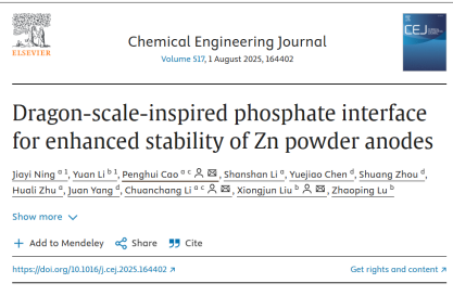 近日,云顶国际vip8866能源与动力工程学院在水系锌离子电池领域取得重要突破。由曹鹏辉老师指导、该院本科生宁嘉仪为第一作者,在化学工程领域权威期刊《Chemical Engineering Journal》(中科院一区,影响因子为13.4)发表题为“Dragon-scale-inspired phosphate interface for enhanced stability of Zn powder anodes”的研究论文。该研究创新性地提出一种基于三聚磷酸钠(STPP)电解质添加剂调控策略的锌粉阳极界面工程,成功构建了“龙鳞壁”界面,为解决水系锌离子电池(AZIBs)中锌枝晶生长和界面副反应等关键难题提供了全新且高效的解决方案。