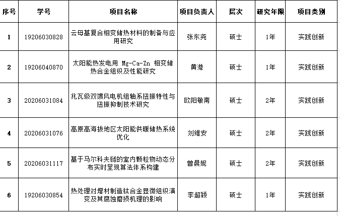 根据《云顶国际vip8866研究生专业学位研究生“实践创新与创业能力提升计划”实施细则》(长理工大[2020]24号)文件精神,经个人申报,学院组织专家评审,拟推荐“云母基复合相变储热材料的制备与应用研究”等6项研究生科研创新项目参加学校评审。具体名单如下: