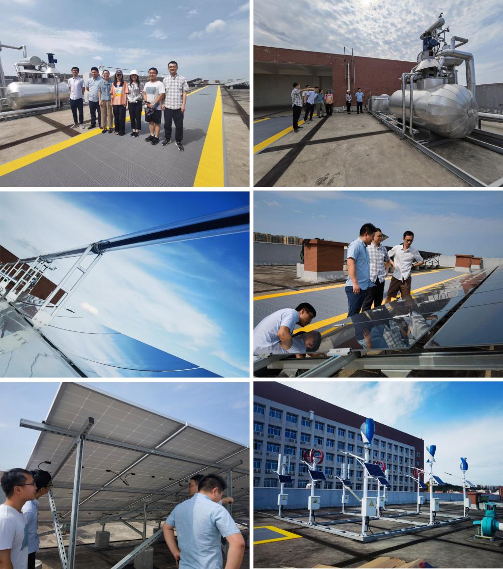 首先,在新能源大楼二号楼楼顶,大家认真细致地参观了源网荷储综合能源系统实验室工程现场的光热集热系统、光伏发电系统、风力发电系统、储热系统等,交流了各系统的工作原理、组成、运行方式、设备关键参数等。