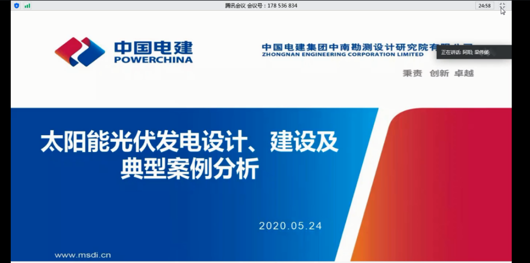 优秀校友中国电建集团中南勘测设计研究院有限公司高级工程师阳萍华的讲座主题为太阳能光伏发电设计、建设及典型案例分析。根据光伏发电站的设计和建设运行,结合光伏发电与其他行业的融汇,对“光伏+”案例进行具体分析。