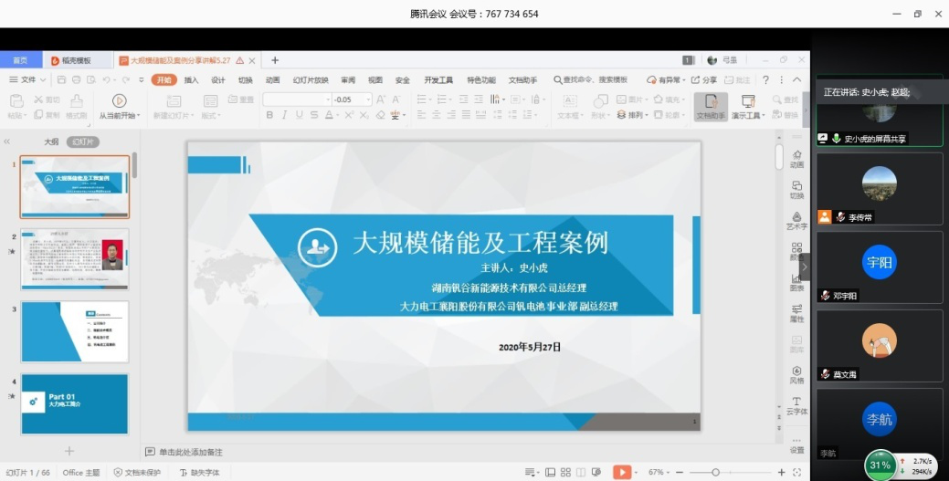 湖南钒谷新能源技术有限公司总经理、大力电工襄阳股份有限公司钒电池事业部副总经理史小虎的讲座主题是大规模储能及工程案例。史小虎从储能技术相关政策上解读国家战略需求,说明大规模储能对电池的要求;对比多种储能方式,介绍液流电池在大规模储能上存在的优势,并结合实际工程案例讲解了液流电池的应用。