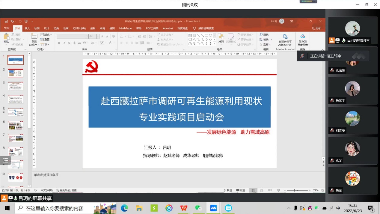6月23日下午,以“发展绿色能源,助力雪域高原”为主题的赴西藏拉萨市调研可再生能源利用现状专业实践团队启动会于线上召开,指导老师赵斌、胡雅妮、彭博及实践团全体成员参加本次会议,团队负责人吕玥主持。