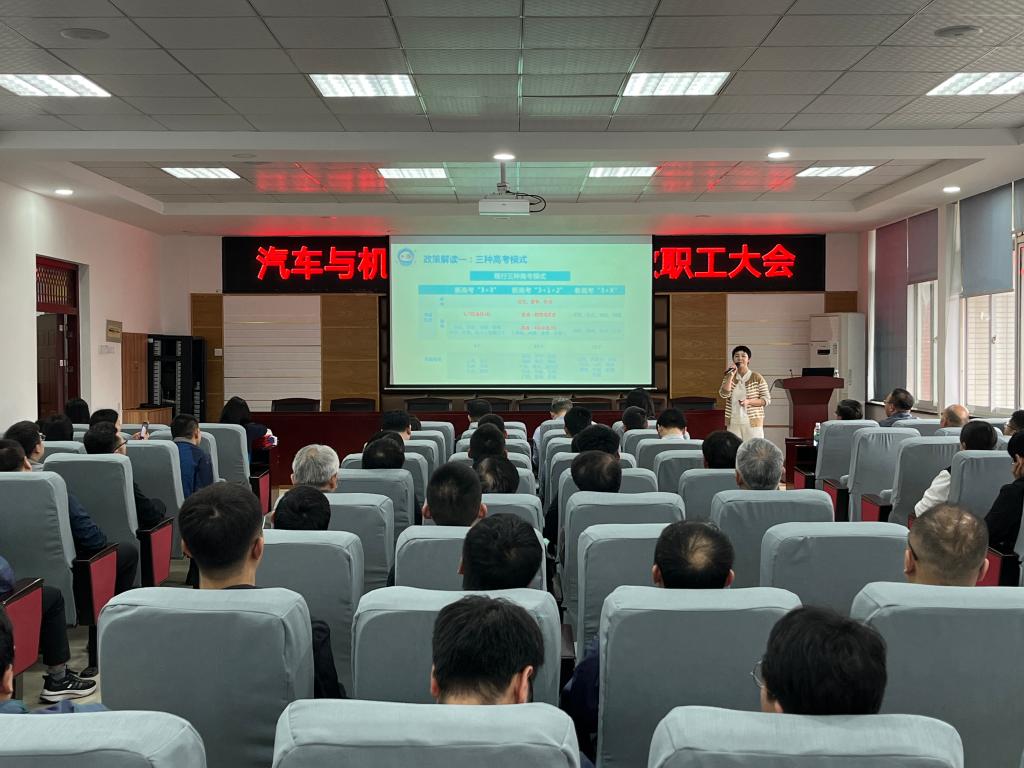 教职工大会有三项议程。首先,招生就业处本科生招生管理科科长贺佐杰老师宣讲了新高考政策,包括招生专业组设置、投档规则、常见问题解答、招生信息获取等内容。其次,胡林院长解读了学院2024年度工作要点,并对绩效管理办法修订内容进行了说明,同时,给学院2024年青年教师教学基本功大赛获奖人员进行颁奖并合影留念。最后,孔伟红书记对学院安全稳定工作进行了布置,强调要提高师生安全防范意识,加强学生心理健康教育;要强化实验室和工作室管理,明确责任人,杜绝安全隐患。
