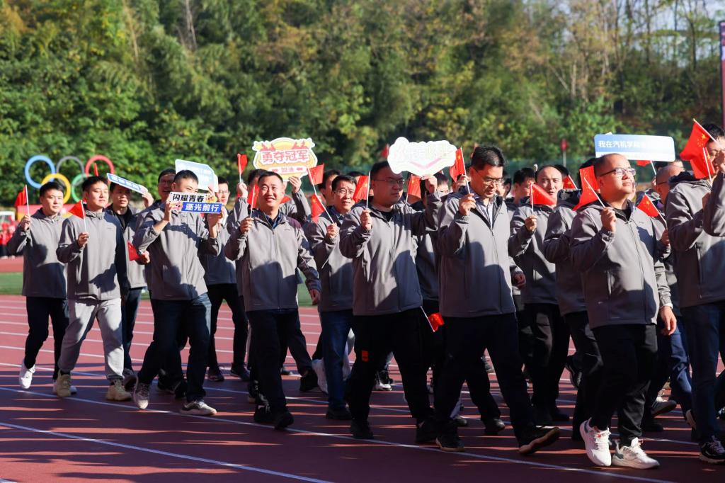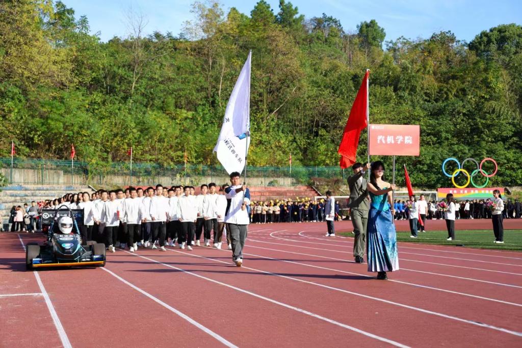 大型团体操表演《大国工匠,长理担当》为整场运动会拉开帷幕。近千名长理学子身着不同颜色的服装,通过队形变化组成“CSUST”“大国工匠”等图案,赢得了现场观众的阵阵喝彩。伴随着激昂的音乐,国旗护卫队、校旗护卫队、鲜花队、彩旗队以及由各学院、各分工会基层组织组成的方阵依次入场。各学院精心准备的节目轮番上演,精彩纷呈。汽车与机械工程学院方阵师生们持扇子,步伐整齐。方阵最前面是威风凛凛的方程式赛车队,E26一出场便收到了现场同学们的呐喊,彰显着汽机学院的特色与实力,后面则是教师方阵,展现出师生团结的风貌。汽机学院的口号“凝心聚力 筑梦汽机”,喊出了他们的坚韧与拼搏精神。整个入场仪式气势恢宏,令人热血沸腾。