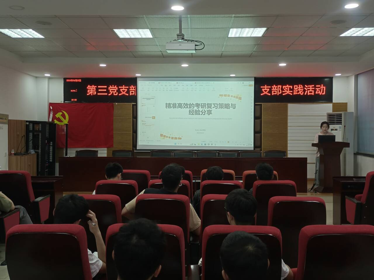 支部党员林海峰同志主要就考试科目、心路历程和复习计划做了详细的讲述,林海峰同志告诉在座同学可以将择校目标适量放高一点,当别人进度比自己快时,也应该稳住自己的心态,要有自己的节奏不被他人轻易带偏,坚持是成功路上的重要保障。随后他将自己考研复习的实际情况与计划分享给同学们作参考。最后他寄语学弟学妹:考研之路,路漫漫兮,不急于求成,不妄自菲薄,有目标,有信心,做好持久战的准备,打好考研这个难仗。