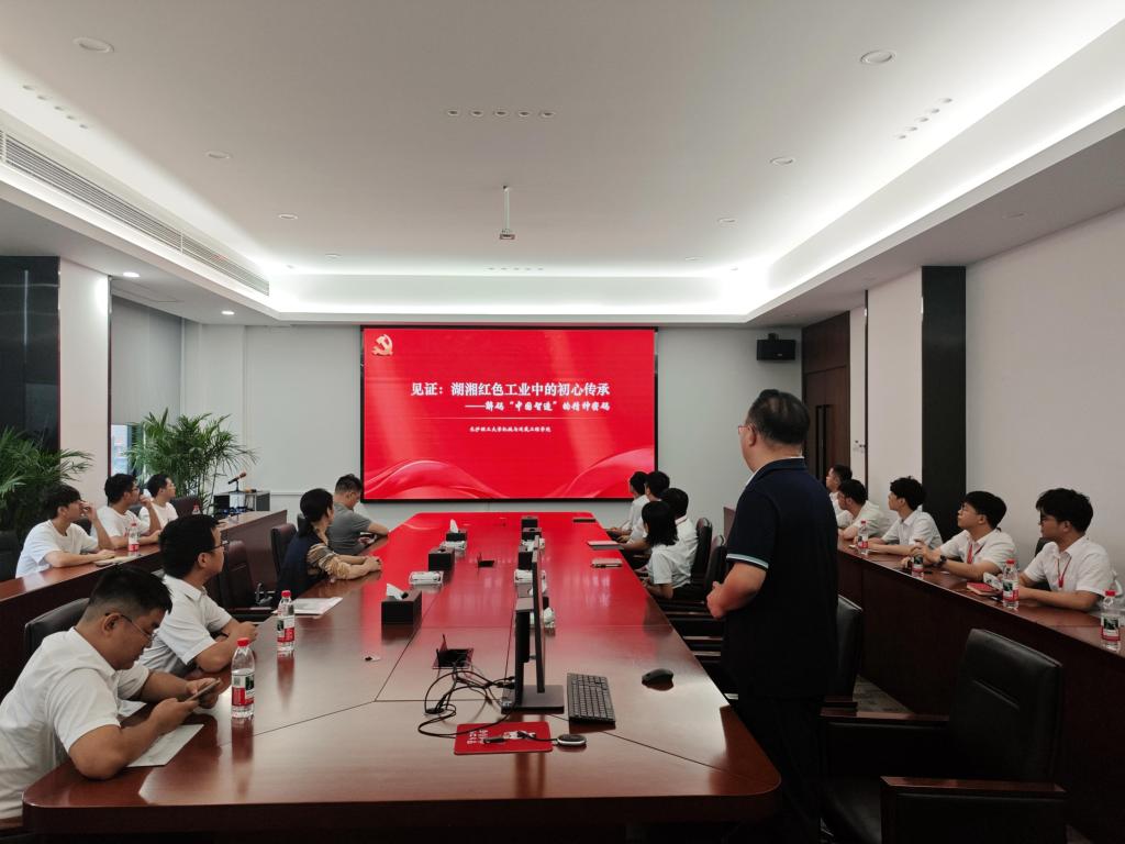在五新装备会议室举行的人才供需对接座谈会上,气氛热烈而融洽。龚俊总经理对公司的发展历程、核心产品及企业文化进行了详细介绍。来自五新的长理毕业生代表8人踊跃发言,分享了他们在企业的成长经历与职业发展,对母校的培养表示感恩,并就学校人才培养与企业需求的衔接提出了宝贵建议。双方围绕暑期专业实践、产业学院建设等议题进行了深入交流,在拓宽学生实习就业渠道、加强产学研合作等方面达成了诸多共识。机械学院党委副书记周小杰以《见证:湖湘红色工业中的初心传承》为题讲授微党课,结合湖湘工业发展历程,阐述了共产党员在国家建设、科技创新中的责任担当。