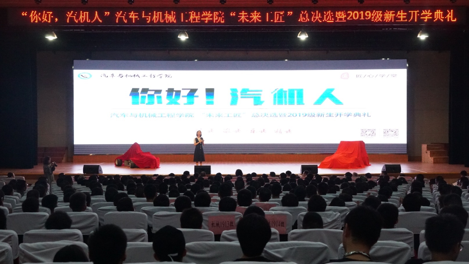 2019年9月22日下午14:00,云顶国际vip8866汽车与机械工程学院于金盆岭校区五教大礼堂举行第二届“未来工匠”总决选暨2019级新生开学典礼。出席本次活动的领导及嘉宾有:院党委书记邱国良,院长杜荣华,申亿机械董事长王凯波,CRT车队赞助商鸿宇驾校李建东,院党委副书记靳攀科,副院长胡林、何志勇,院党委委员胡宏伟、唐宏宾,CRT车队指导老师伍文广,以及2019级新生班主任代表徐小林、王向红。本次典礼由学工办宋新老师主持。
