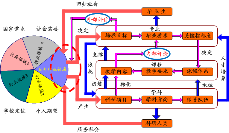 最后,通过学科、专业与课程三位一体形成学院特色。如图1所示:学科、专业、课程是三位一体的关系,国家需求与社会需要决定了专业的培养目标,同时也会产生学科团队的科研项目需求,当这二者相吻合时,学科团队通过科研创造的知识就很容易转化为教学内容,毕业后的校友也就能够更好地促进学科团队的产学研合作,学科与专业就能得到良性互动和协调发展。如图中所示:国家需求与社会需要会细分成很多个行业领域,假设我们的毕业生和科研人员都聚焦在目标行业领域,则目标行业领域越集中,科研项目的研究成果转化成教学内容就越多,我们的学科专业特色就越鲜明。