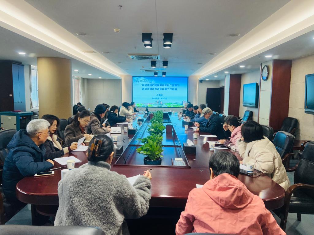 为了积极响应国家关于渐进式延迟法定退休年龄的政策调整,2025年1月10日,学校人事处组织今年第一季度拟退休教职工在一办三会议室开展银龄课堂,开展弹性退休制度下退休及养老金申领工作宣讲。