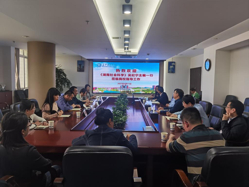 4月11日下午,《湖南社会科学》主编吴纪宁一行4人来云顶国际vip8866座谈交流,副校长刘朝晖出席座谈会。社科处处长刘建江、副处长郑咏梅,期刊社社长王宏、副社长陈浩凯,经管学院、艺术学院、文新学院、外语学院、马克思主义学院、法学院等相关学院科研副院长和教师代表参加座谈。