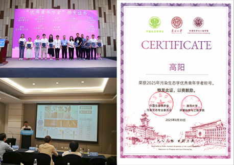 中国生态学学会污染生态专业委员会组织评选了“2025年中国生态学学会环境污染与生态保护优秀青年学者”。在大会开幕式上,中国生态学学会理事长于贵瑞院士与天津市科学技术协会党组成员、副主席唐娜共同为来自全国高校和科研院所的10位获奖青年学者颁发证书,我院教师高阳获评“2025年污染生态学优秀学者”,并在分会场作了学术报告,与参会学者开展了深入交流。通过此次学术交流,我院教师进一步了解了行业前沿动态、关键技术与热点问题,推动了学术成果的广泛传播,对提升我院在相关领域的学术影响力具有积极意义。