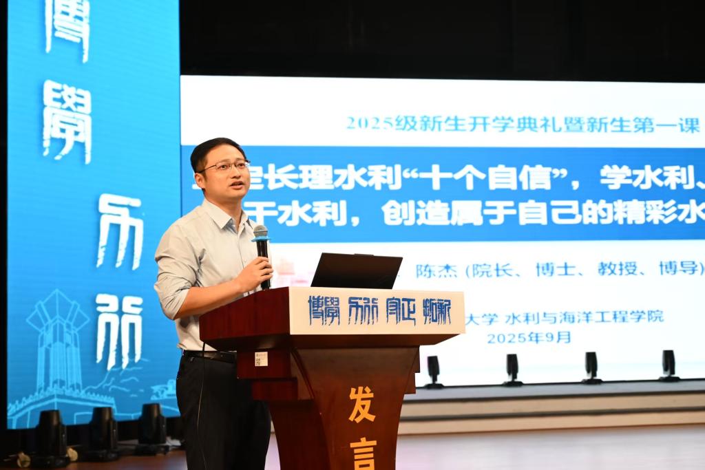 陈杰院长讲授“坚定长理水利十个自信”新生第一课。通过详实数据与案例,系统阐释学院在历史底蕴、学科实力、专业特色、人才培养、平台支撑、行业前景等维度的独特优势,寄语新生坚定自信、深植情怀、勇于创新,在新时代水利与海洋事业中书写精彩人生。