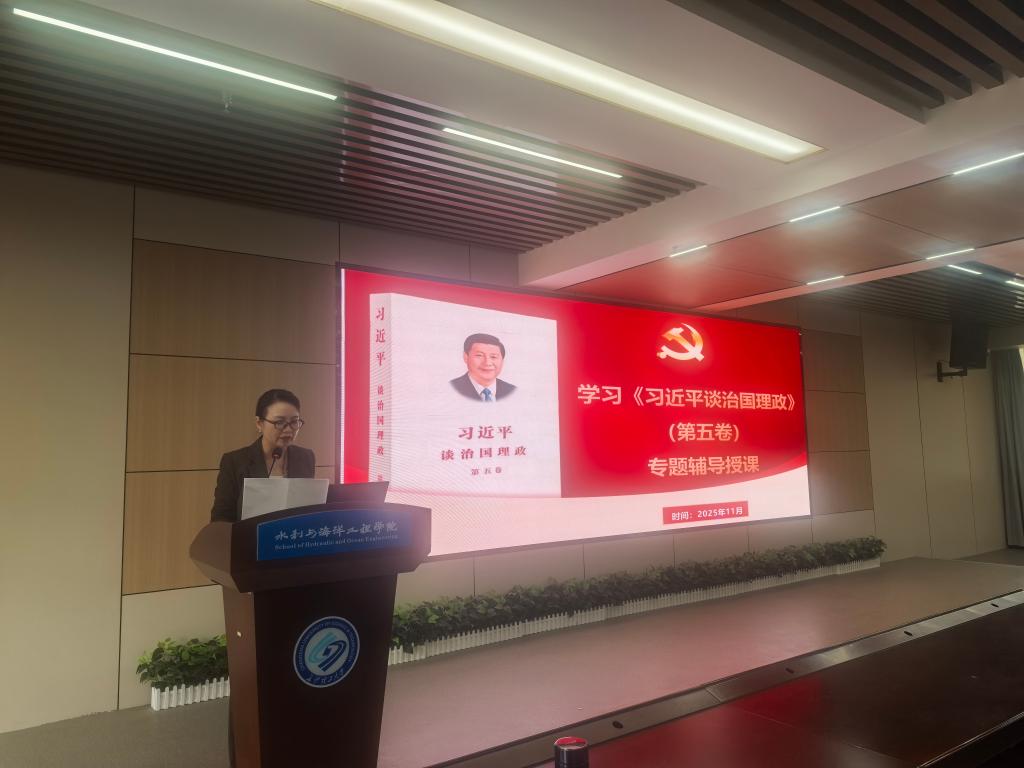 为深入学习贯彻习近平新时代中国特色社会主义思想,切实用党的创新理论武装头脑、指导实践、推动工作,11月4日下午,水利学院在新能源1号楼2楼会议室举行“学习《习近平谈治国理政》第五卷专题辅导”报告会。报告会由学院党委书记喻玲娜担任主讲,学院党委班子成员及全体教职工共同参加学习。