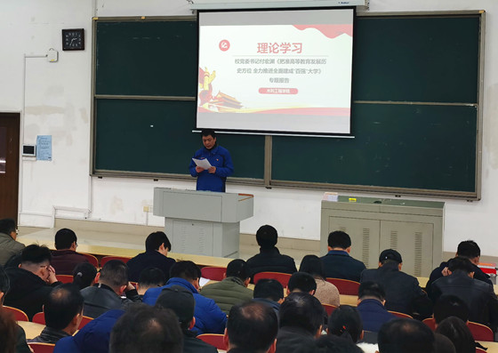 水利学院全体师生党员在院党委副书记吴振华的带领下,一起认真学习了付书记的报告,尤其是在高校教育、人才培养、服务地方等方面,水利师生党员更是深有感悟。党员孙士权学习后谈到:“作为一名一线教师党员,我将继续发挥共产党员的先锋模范带头作用,全身心投入到学校的发展与建设中,以高度的责任感做好本职工作,为建设百 强大学和建设特色鲜明的一流水利学科燃烧自己的青春!”