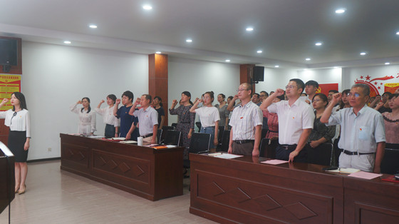 学院党委领导为获奖集体和个人颁发奖状,并为今年新发展的预备党员授予党员徽章,将党的理想信念传递给新一批党员。全体师生党员在党旗前重温了入党誓词,再次向党表达了自己的初心和使命。