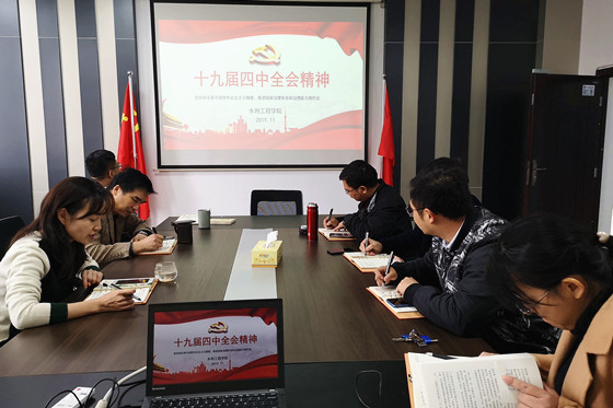 11月18日下午,水利工程学院党委中心组在工三B446开展“不忘初心、牢记使命”主题教育第七次集中学习,学习的主要内容为党的十九届四中全会精神。本次学习由院党委书记喻玲娜主持,全体中心组成员参加学习。