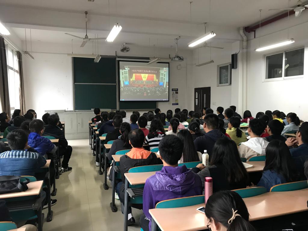 会议开始,全体师生跟随大会现场起立。习近平同志代表十八届中央委员会向大会作了主题为“不忘初心,牢记使命,高举中国特色社会主义伟大旗帜,决胜全面建成小康社会,夺取新时代中国特色社会主义伟大胜利,为实现中华民族伟大复兴的中国梦不懈奋斗”的报告。习近平总书记的报告立足当前,着眼长远,既有高屋建瓴的战略思想,又有切实可行的战略举措,系统回答了新时坚持和发展什么样的中国特色社会主义、怎样坚持和反展中国特色社会主义的重大问题,深刻把握了共产党执政规律、社会主义建设规律、人类社会发展规律,构建了一个科学完整的思想理论体系,是马克思主义中国化的重大理论创新成果,开辟了当代中国马克思主义发展新境界。习近平指出,在全面建成小康社会决胜阶段以及中国特色社会主义发展关键时期,本次大会的召开具有重要指导意义。习近平在报告中提出建设教育强国是中华民族伟大复兴的基础工程,必须把教育事业放在优先位置,加快教育现代化,办好人民满意的教育。