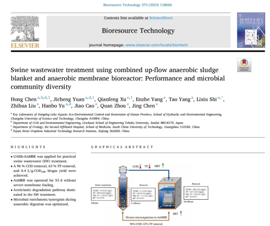 引用格式:Chen Hong, Yuan Jicheng, Xu Qianfeng, Yangenzhe, Yangtao, Shi Lixiu, Liu Zhihua, Yu Hanbo, Cao Jiao, Zhou Quan, Chen Jing. Swine wastewater treatment using combined up-flow anaerobic sludge blanket and anaerobic membrane bioreactor: Performance and microbial community diversity. Bioresource Technology, 2023, 373, 128606.