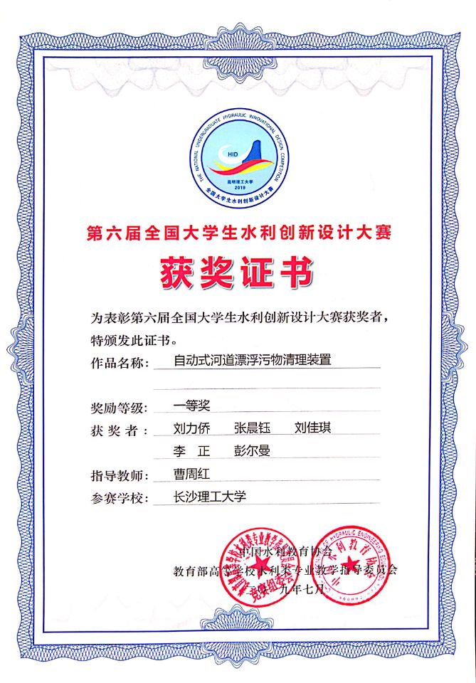 本次大赛的主题和内容为“智慧水利”,利用多种技术围绕智慧水利建设等进行实物作品的创新设计与制作,秉承可持续发展理念,注重节水优先、绿色生态、人水和谐及新技术的应用。比赛分作品展示交流、分组答辩和答辩复赛三个环节,经过两天的激烈角逐,由云顶国际vip8866水利工程学院刘力侨、张晨钰、刘佳琪、李正、彭尔曼同学完成,曹周红老师指导的作品《自动式河道漂浮污物清理装置》和由陈林涛、李胜湘、周侗、徐晖、蒋晗同学完成,黄筱云老师指导的作品《环保疏浚防细颗粒污染扩散气幕帘》分获一等奖;由栗小钡、何洪波、姚嘉伟、张娜、黄兴宇同学完成,万俊力、孙士权老师指导的作品《一种处理重金属微污染水源水的磁性炭/超滤新型工艺》获二等奖。