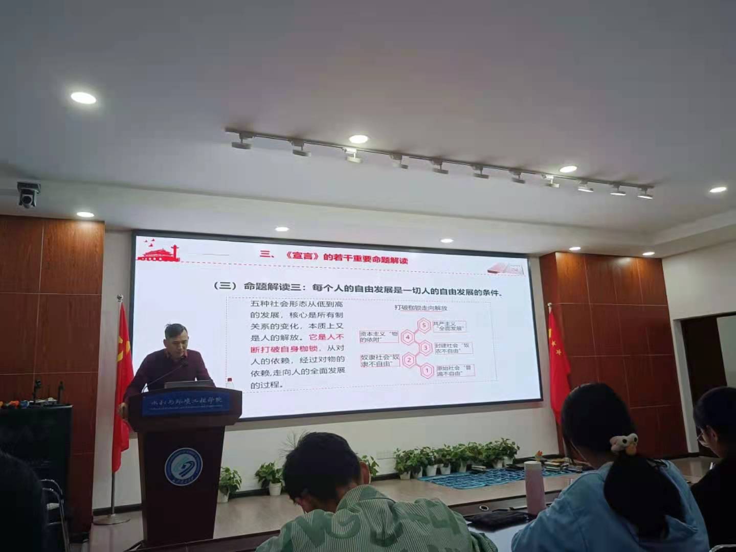 11月7日晚,水利与环境工程学院分党校在工科三号楼B319开展了入党积极分子培训班“把握真理力量,补足‘精神之钙’——《共产党宣言》解读”专题党课,本次党课由马克思主义学院黄前程老师主讲。