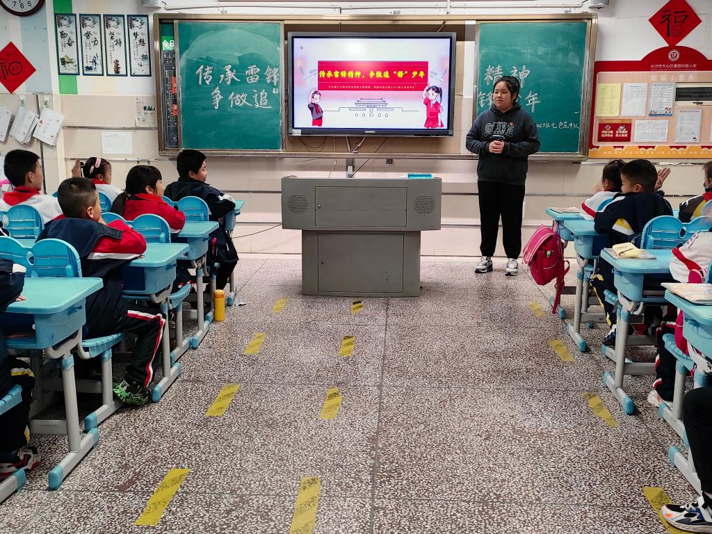 宣讲党员张钰婷通过音像资料、图文解说带领学生们走进雷锋童年、聆听雷锋故事、感悟雷锋精神,并为小学生们讲解了雷锋家乡小雷锋、12岁的望城女孩周美玲从渣土车下勇救3岁幼童的故事,激发小学生们传承雷锋精神的热情。张钰婷将雷锋精神具象化为力所能及的日常小事,鼓励学生们以实际行动践行雷锋精神。在互动环节,学生们争相举手、踊跃发言。