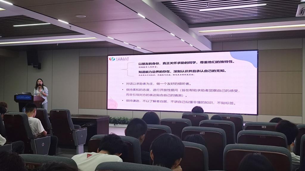 培训聚焦“朋辈互助员基础知识”这一主题,王正博首先深入浅出地阐释了“朋辈”关系的独特价值——源于同龄人的理解、接纳与亲近感是开展有效心理互助的基石。她系统性地明确了朋辈互助员需承担的“四合一”复合角色:心理活动的组织者、心理知识的传播者、心理信息的传递者、心理困扰的帮助者,并详细阐述了每种角色的具体职责和所需的核心能力,包括敏锐的观察力、真诚的同理心、有效的沟通技巧、准确的资源链接能力以及严格的保密意识。