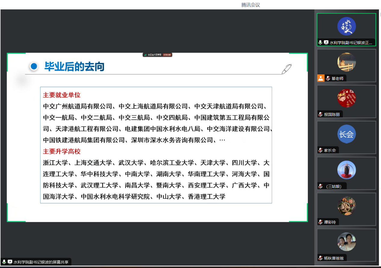 为进一步加强家校联动,为学生的职业规划提供更有力的支持。9月26日晚,水利学院召开了“家校协同育人,共筑成长同心圆”2021级本科生家长会,院长陈杰、院党委副书记银波出席本次会议,近300名家长线上参会,年级辅导员綦丽主持会议。