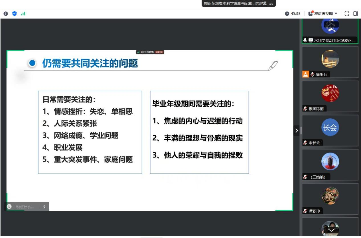 银波针对2025届毕业生当前的就业情况作了介绍,并就学生备考和求职过程中的心理状态作了分析,向家长们详细介绍了学校心理健康中心和学院的成长辅导团队以及相关支持平台。她指出家长应与学校紧密联系,畅通信息渠道,为学生的身心健康成长提供全方位的保障和支持。