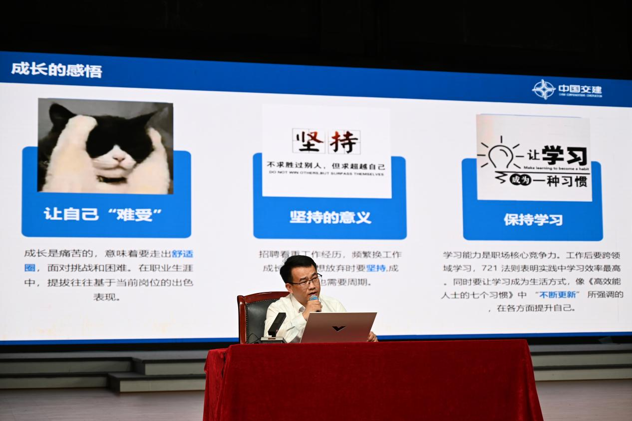 随后,周红涛带来了题为“取发展之势、明生涯之道、优职业之术”的专题报告。他介绍了一航局的历史、成就、企业文化以及与学校的渊源,并分享了自己入职21年来的成长故事和人生感悟,他鼓励同学们要勇于走出舒适区,相信坚持的力量,做到持续学习,与时俱进,于坚持坚守中不断提升自身竞争力,阐述了职业生涯规划的内涵及本质,从目标、路径、方法三个维度讲述了如何将规划变成现实。他指出要善于取势,做好明道,懂得优术,强调了把握时代发展脉搏、明确个人职业目标以及优化职业技能的重要性,鼓励学生们积极投身国家建设,实现个人价值和社会价值。