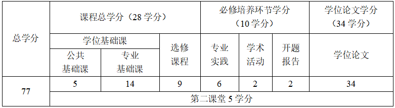 3. 采用“课程学习+专业实践+学位工作”的方式,培养环节按照“0.5+0.5+0.5+1.0+0.5”的方式安排,具体为:第一学期(0.5年)主要完成公共课程和专业基础课程学习;第二学期(0.5年)完成专业课程、选修课程学习;第三学期(0.5年)开展专业实践和学位工作选题,学位论文工作一般应与专业实践相结合;第四-五学期(1.0年)完成学位工作并取得相关成果;第六学期(0.5年)完成学位工作总结和学位申请材料准备、学位申请审核、答辩和授位。其中,第2个0.5年与第3个0.5年的安排次序可互换。学术交流和社会实践,可在学期间完成。